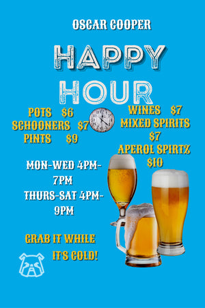 Drop in for a quick coffee or sit back and relax with our all day breakfast menu. Lunch is always a little different as our food changes seasonally. With the exception of a few of our staples, Oscar Cooper always strives on providing you with fresh new takes on some of your favorite meals.Happy Hour Cocktails and Damn Fine Jaffles All Day Every Day